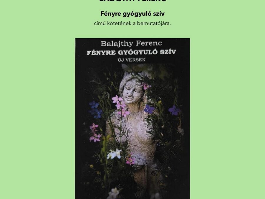 Április 21-én kedden, 17 órai kezdettel mutatják be a Vörösmarty Társaság székházában Balajthy Ferenc „Fényre gyógyuló szív” című új verseskötetét. A szerzővel Váczi Márk, a Vörösmarty Társaság alelnöke beszélget, a rendezvényen Cserta Balázs előadóművész közreműködik.