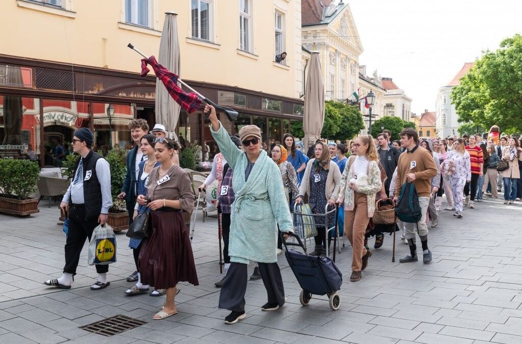 Kedden délelőtt szokatlan látvány fogadta az arra sétálókat a Palotai Kapu téren: a gyülekező Hupikék törpikék mellett Kung Fu Pandák próbálták a koreográfiát, miközben a bőrdzsekis greaserek és pörgőszoknyás lányok ufókkal, cápákkal és egy óriás békával társalogtak. Hamarosan befutott a Pécsi Tudományegyetem Művészeti Karának hallgatóiból alakult PTE Brass Band is, így a színes sokadalom karneváli hangulatban, Hókuszpók vezetésével elindult a Belvároson át a Zichy liget felé.